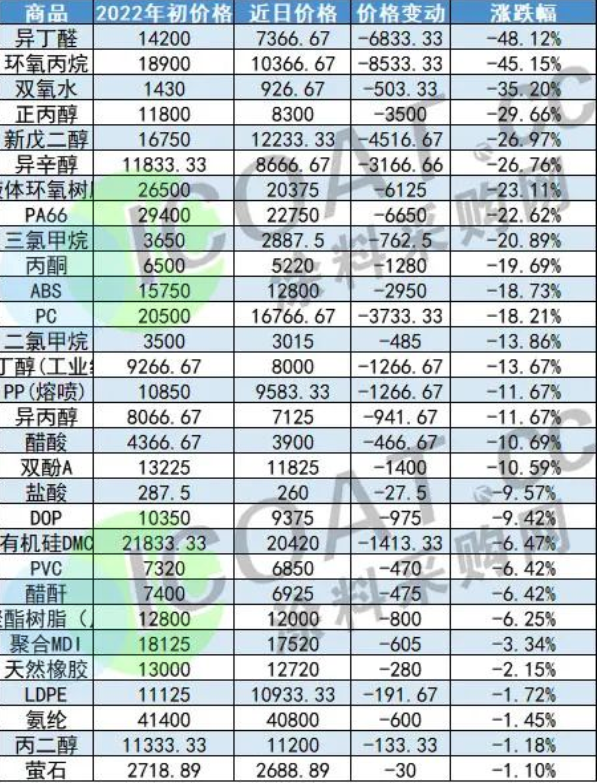 雙氧水目前報價926.67元/噸,較年初價格下跌503.33元/噸,跌幅35.20%;異辛醇目前報價8666.67元/噸,較年初價格下跌3166.66元/噸,跌幅26.76%;PA66目前報價22750元/噸,較年初價格下跌6650元/噸,跌幅22.62%;三氯甲烷目前報價2887.5元/噸,較年初價格下跌762.5元/噸,跌幅20.89%;丙酮目前報價5220元/噸,較年初價格下跌1280元/噸,跌幅19.69%;ABS目前報價12800元/噸,較年初價格下跌2950元/噸,跌幅18.73%;PC目前報價16766.67元/噸,較年初價格下跌3733.33元/噸,跌幅18.21%;PP(熔噴)目前報價9583.33元/噸,較年初價格下跌1266.67元/噸,跌幅11.67%。
