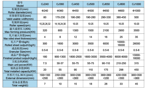 CJ系列干法輥壓造粒機是采用干法擠壓工藝技術,對含水量<10%的粉狀物料進行壓縮成片,再經(jīng)過破碎、整粒、篩分工藝,使片塊狀物料變成符合使用要求的顆粒狀物料。干法輥壓造粒主要是靠外部加壓方式,使物料強制通過兩個相對旋轉的輥輪間隙,壓縮成片。在輥壓過程中,物料的實際密度能增大1.5-3倍,從而達到一定的強度要求。