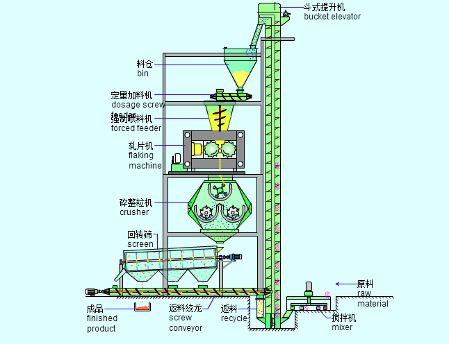 各種干粉物料從設備頂部加入,經(jīng)脫氣、螺旋預壓進入兩個平等軋輥,軋輥相對旋轉,物料被強制送入兩輥之間,軋輥將物料咬入輥隙進行強制壓縮,物料通過壓縮區(qū)后,物料的表面張力和重力使之自然脫出。脫出后的指條狀團塊進入碎粒機由旋轉刀排破碎,被破碎的物料進入整粒機通過滾動刀排使顆粒和部分粉狀物料進入旋振篩進行篩分。合格品通過輸送機被送入成品倉。粉狀篩下物料通過輸送機再次被送回原料倉進行二次輥壓,擠壓力的大小可根據(jù)造粒操作的需要由液壓系統(tǒng)進行調(diào)節(jié)。 通過改變輥面開槽形式,可得到片狀、條狀、扁球狀等物料。