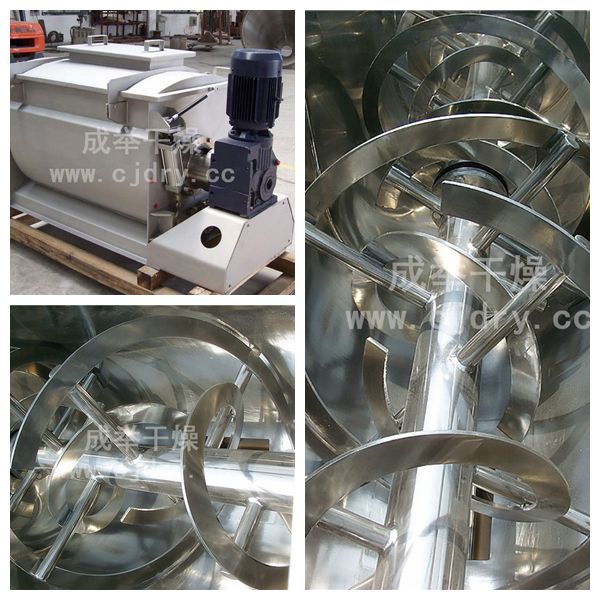 臥式螺帶混合機由臥式U形容器、帶(或者不帶)開口的頂蓋,裝有雙層螺帶攪拌葉片的單軸、傳動單元、支撐架、密封件、出料結(jié)構(gòu)等部件組成。螺帶狀葉片一般做成雙層,外層螺帶使物料從兩側(cè)向中央?yún)R集,內(nèi)層螺帶使物料從中央向兩側(cè)擴散。物料在反復(fù)流動中形成渦流,從而達到均勻混合的目的。